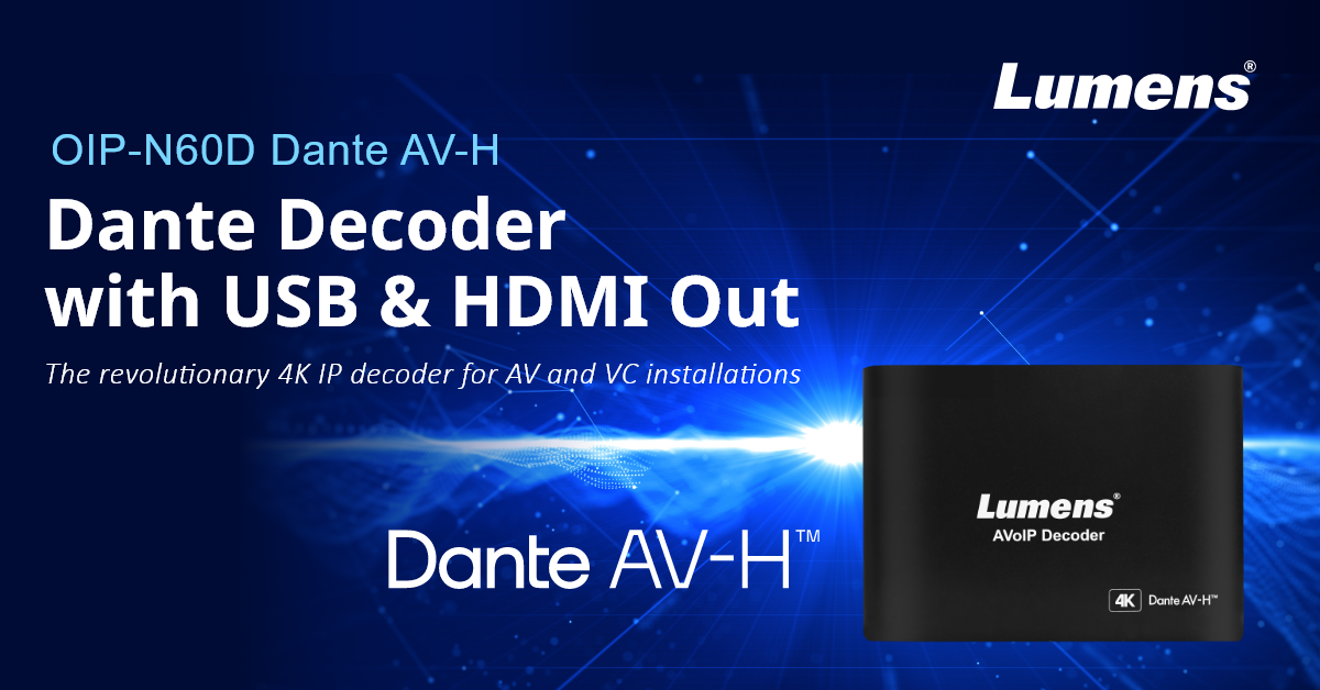 Lumens Digital Optics Inc. introduces its OIP-N60D Dante AV-H, a mini decoder which integrates Dante audio and video sources into hybrid communications. As a user-friendly system, OIP-N60D Dante AV-H is the first all-in-one audio and video Dante decoder that connects to a user's laptop with a single USB cable.