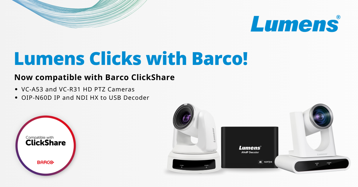 The revolutionary Lumens 4K VC-TR60A PTZ camera is now certified for use with Barco ClickShare. Sporting dual cameras and AI human recognition technology, VC-TR60A is a feature-rich unit that meets the needs of customers looking for a supremely flexible meeting room camera.
