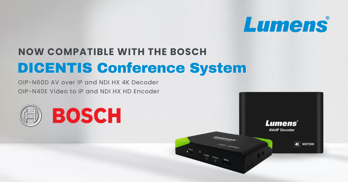 Lumens Digital Optics Inc. announces that its new mini encoders and decoders are compatible with the Bosch DICENTIS Conference System. With this development, installers can quickly add HDMI sources to the Bosch IP network and easily link the DICENTIS system to video conferencing platforms.