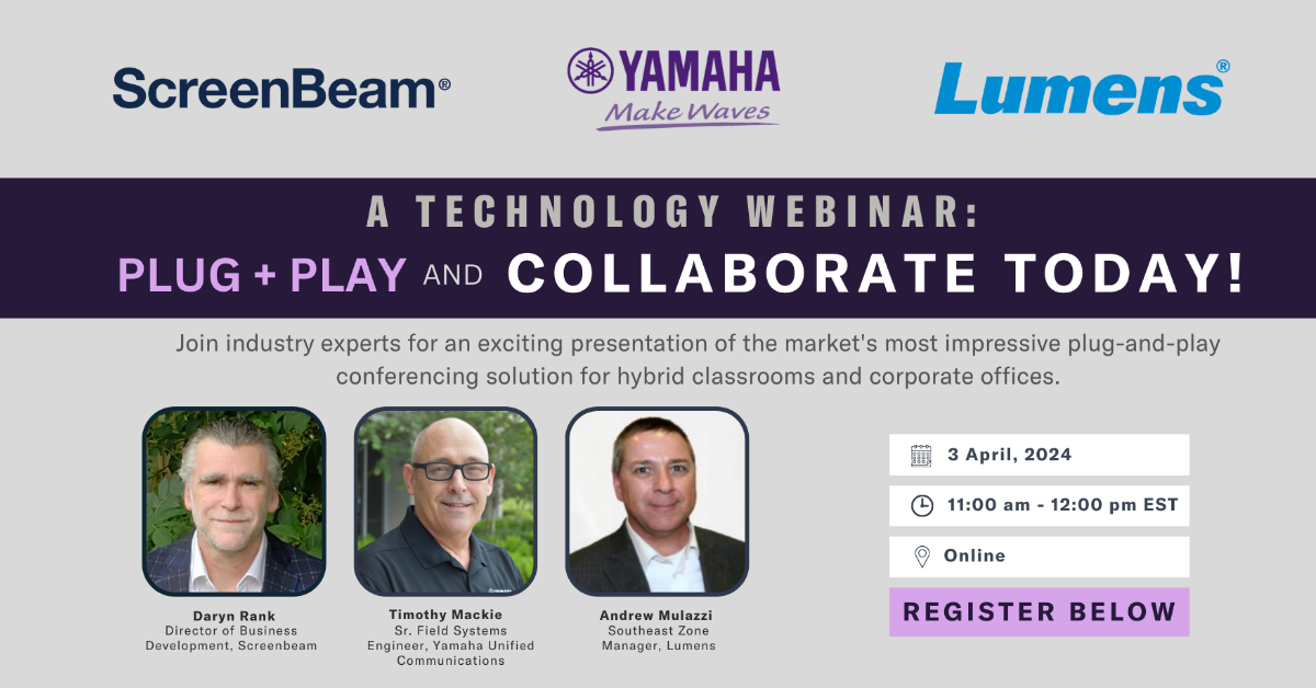 Join Greg Carswell and Tim Mackie (Yamaha), Andrew Mulazzi (Lumens), and Daryn Rank (Screenbeam) for an exciting presentation of the market's most impressive plug-and-play conferencing solution for hybrid classrooms and corporate office spaces.