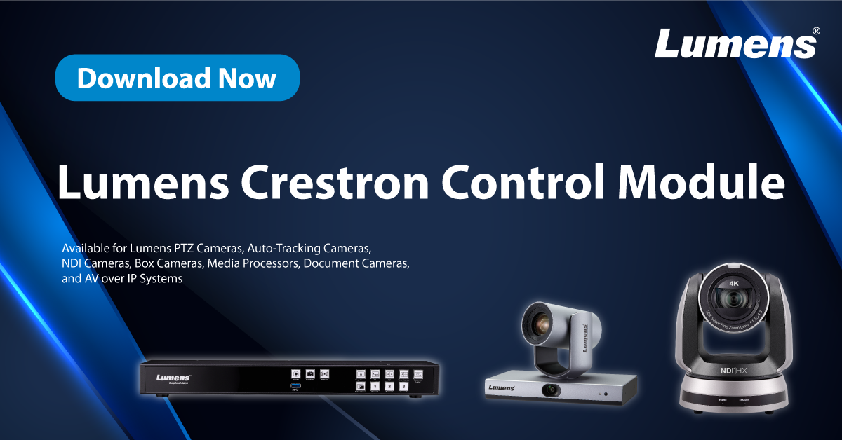 Lumens® Digital Optics Inc. today announced the availability of a new Crestron control module for our new VC Camera. The module seamlessly connects Lumens cameras and the Crestron control system via IP or RS-232 allowing users to remotely control Lumens cameras' Pan-Tilt-Zoom mechanism, preset positions, as well as auto-framing and auto-tracking functionalities.