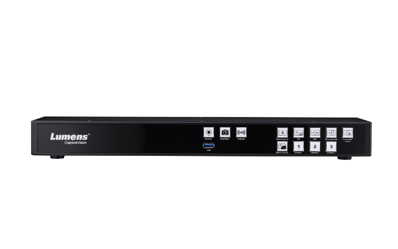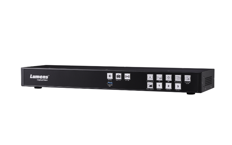 A media processor is an all-in-one station that can produce, record, and stream audio-visual presentations and multi-camera productions. Switching and mixing multiple sources helps create engaging and professional events, complete with logo insertion and a lower third overlay, background, and timestamp. A Media Processor records the live program output and each video input independently. It simultaneously streams live to your preferred platform whether that's YouTube, Twitch, or Facebook. Lumens' Media Processor also integrates seamlessly with Panopto and Kaltura.