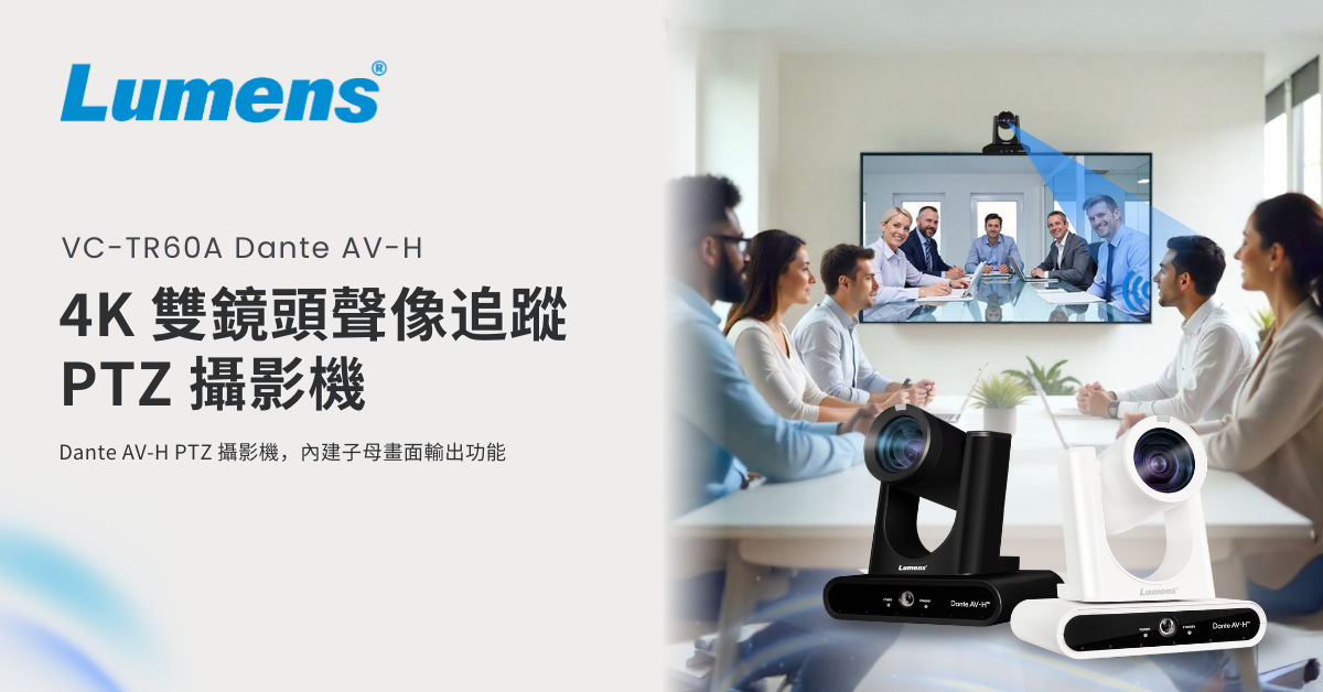 Lumens® 捷揚光電發布全新 VC-TR60A Dante AV-H 4K 雙鏡頭聲像追蹤 PTZ 攝影機,此款攝影機專為 1G 和 10G 乙太網路安裝優化,並支援 Dante Controller、Dante Domain Manager 和 Dante Director 等第三方工具,讓使用者與管理者能夠透過熟悉的應用程式輕鬆控制、路由及保護影像串流。