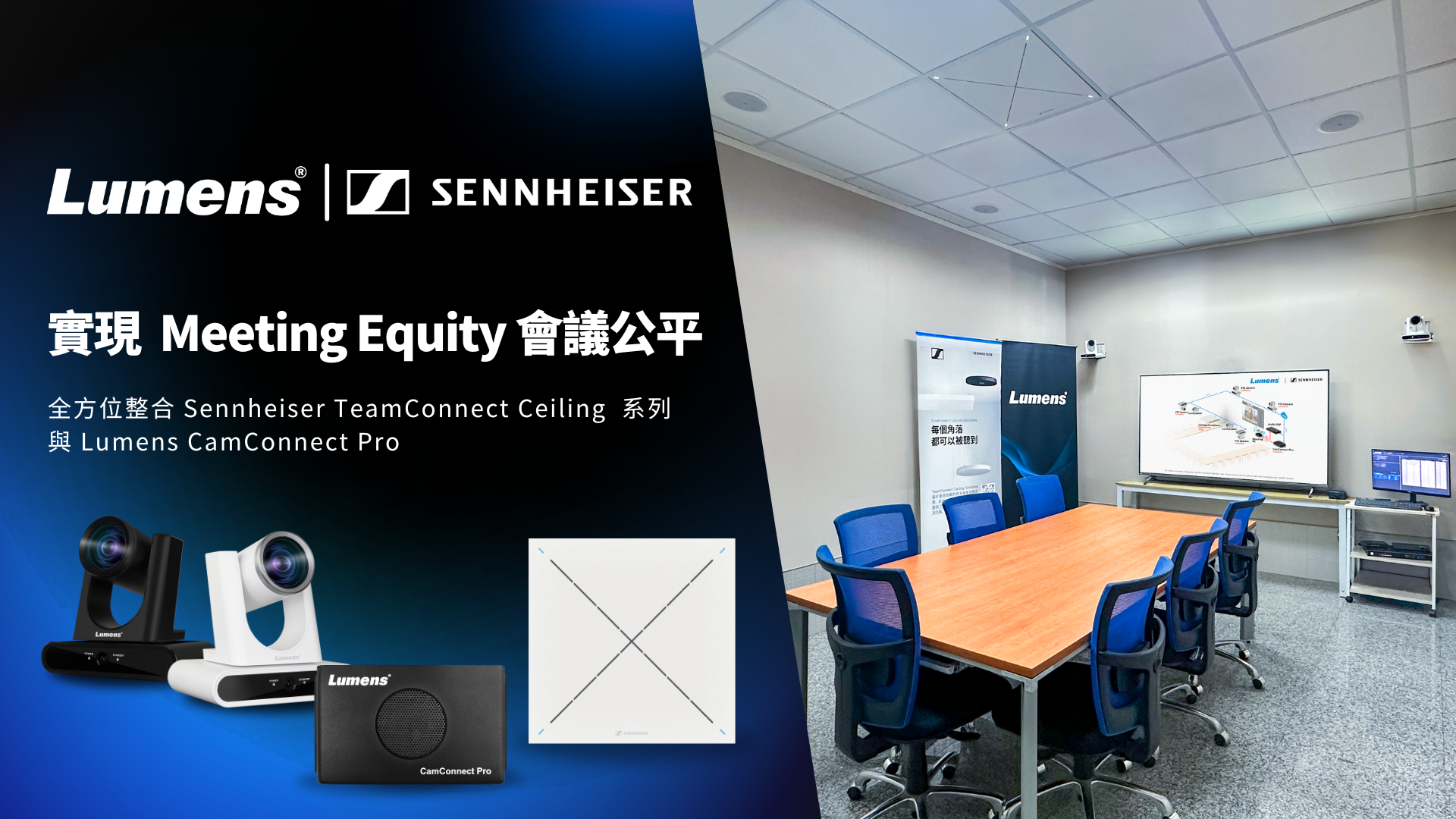 Lumens® 捷揚光電與 Sennheiser 攜手合作,於 Lumens 台灣總部打造專業會議空間,完整呈現 Lumens CamConnect Pro 自動相機切換處理器與 Sennheiser TeamConnect 吸頂式麥克風的無縫整合,為真實會議中常見的影音應用痛點提供解方,同時實現前所未有的會議公平性與沉浸式體驗。