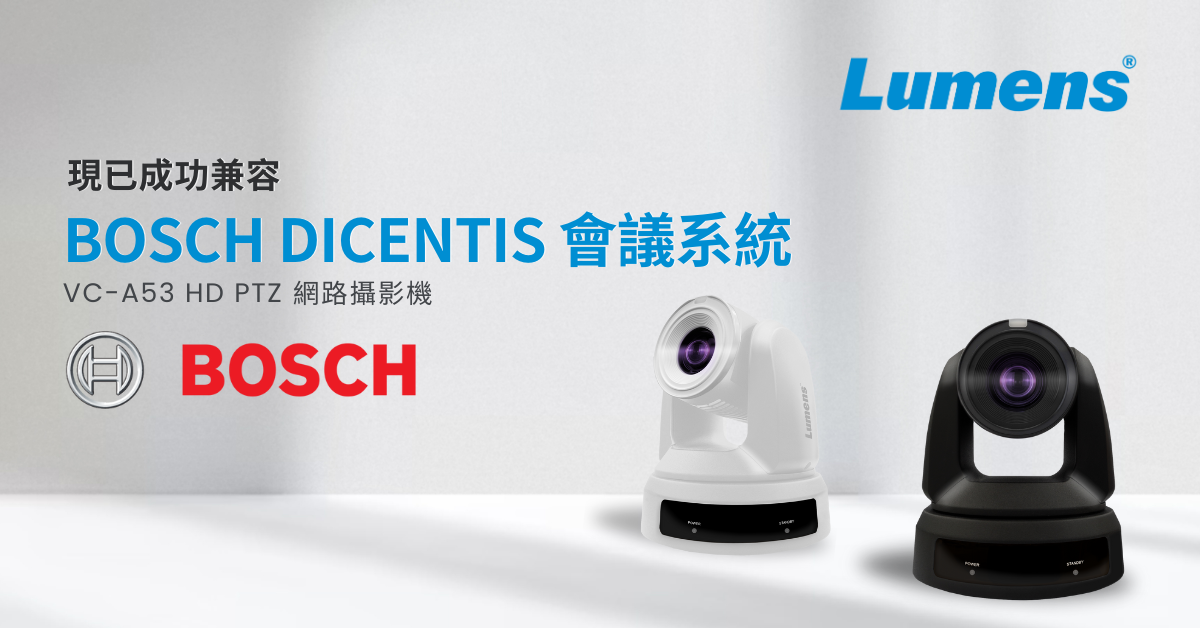 Lumens® 捷揚光電宣布 VC-A53 HD PTZ 網路攝影機已可兼容於 Bosch DICENTIS 會議系統。VC-A53 作為一款專業級 HD 攝影機,具備 20 倍光學變焦和支援四路同時輸出(3G-SDI、HDMI、USB 和 IP 網路)高畫質影像,透過專業高速馬達效能,攝影機可以快速移動鏡頭,精確捕捉講者和與會者的畫面,提升會議效果。