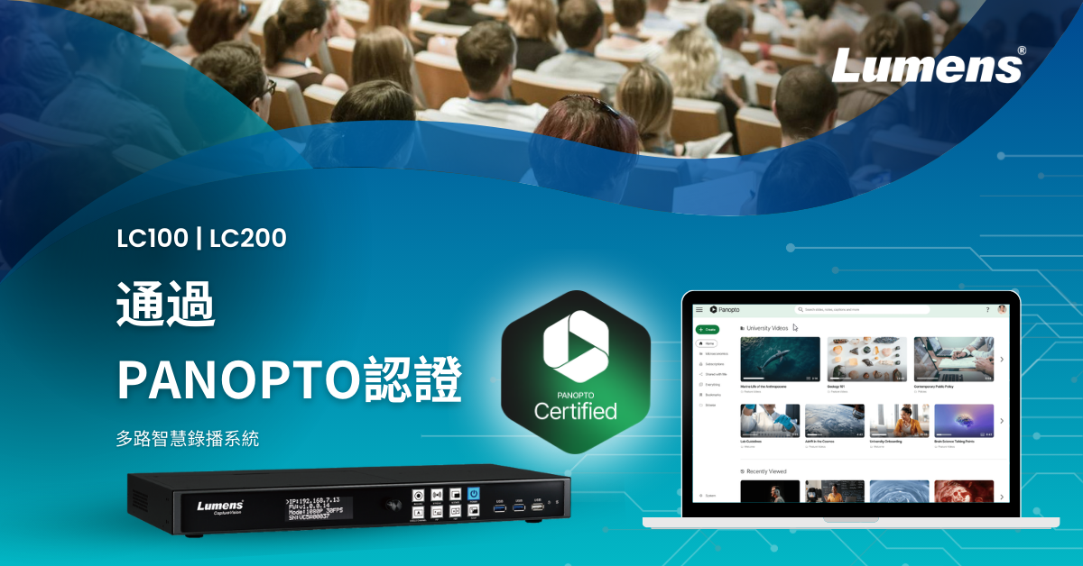 Lumens® 捷揚光電宣布旗下產品 LC100 和 LC200 錄播系統已獲得 Panopto 影音內容管理平台的認證。這兩款產品是 Lumens CaptureVision 系列的一部分,現在能夠與 Panopto 完美整合,支持高階學習及內容管理。