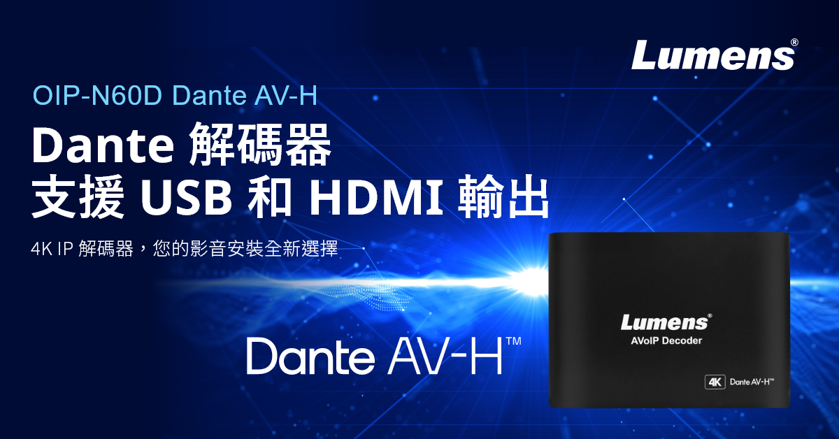 Lumens 捷揚光電宣佈推出 OIP-N60D Dante AV-H,這是一款體積輕巧的解碼器,能夠將 Dante 音訊和視訊源輕鬆整合到混合通訊中。作為一個用戶友善的系統,OIP-N60D Dante AV-H 是首款單一機台結合音訊及視訊的 Dante 解碼器,透過一條 USB 線就可連接至用戶的筆記型電腦。