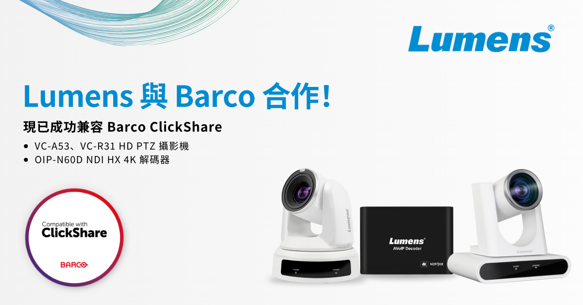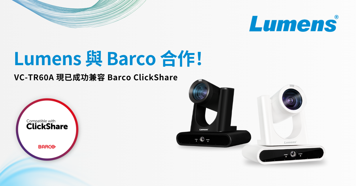 Lumens® 捷揚光電革命性 VC-TR60A 4K PTZ 攝影機現已獲得 Barco ClickShare 認證。VC-TR60A 採用雙鏡頭設計與 AI 人體辨識技術,功能強大,能滿足客戶對於高度靈活的會議攝影機需求。