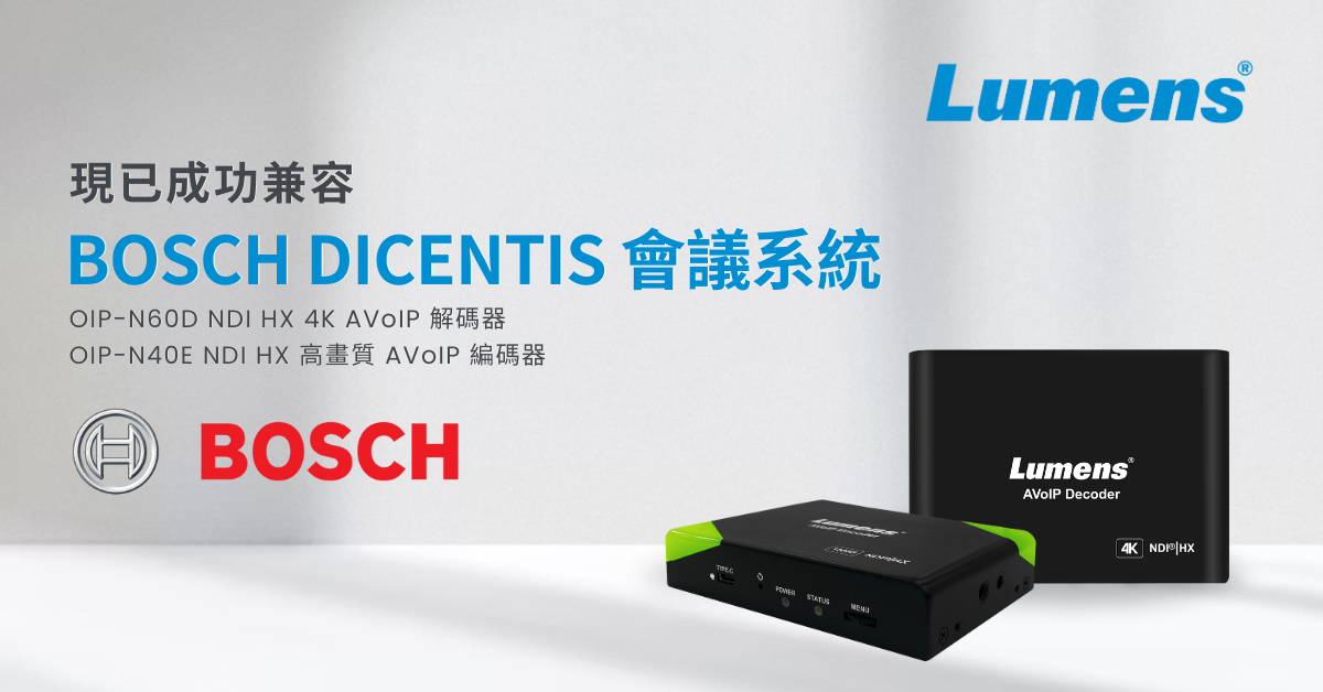 Lumens 捷揚光電宣佈其最新的迷你編碼器與解碼器已完全兼容 Bosch DICENTIS 會議系統。這項創新使安裝人員能夠快速將 HDMI 訊號源添加到 Bosch IP 網路,並輕鬆地將 DICENTIS 系統連接至視訊會議平臺。