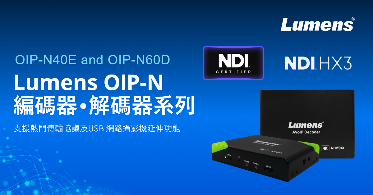 Lumens® 捷揚光電今日宣布推出全新網路分佈式矩陣系列產品 (OIP-N),加入旗下AVoIP解決方案的陣容,包括可同時搭配使用的編碼器 (OIP-N40E) 及解碼器 (OIP-N60D),此系列可支援 NDI HX3、NDI HX2和RTSP 等網路傳輸協議。兩款高性能編、解碼器皆可透過標準的 1 GB Ethernet 網路傳輸超低延遲、高品質的影像,亦可選擇使用 USB 充電器或透過乙太網路供電(PoE)。