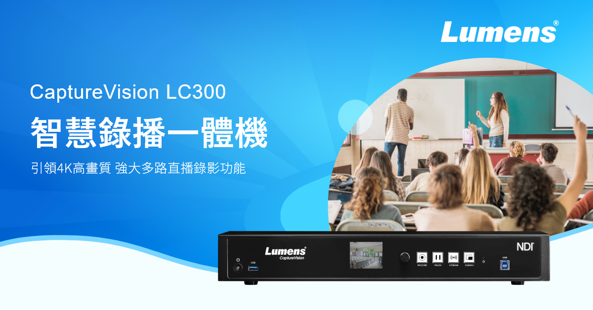 Lumens® 捷揚光電推出一款全新 4K 錄播系統-LC300,可支援四路影像輸入,包括 NDI HX3 和 NDI High Bandwidth 串流功能。LC300 錄播系統具强大且靈活度高的功能性,可用於錄製課堂內容,例如切換和混合訊號源、多頻道錄製和串流,以及儲存到內部或網路儲存裝置,無需繁雜的操作流程,即可輕鬆錄製。