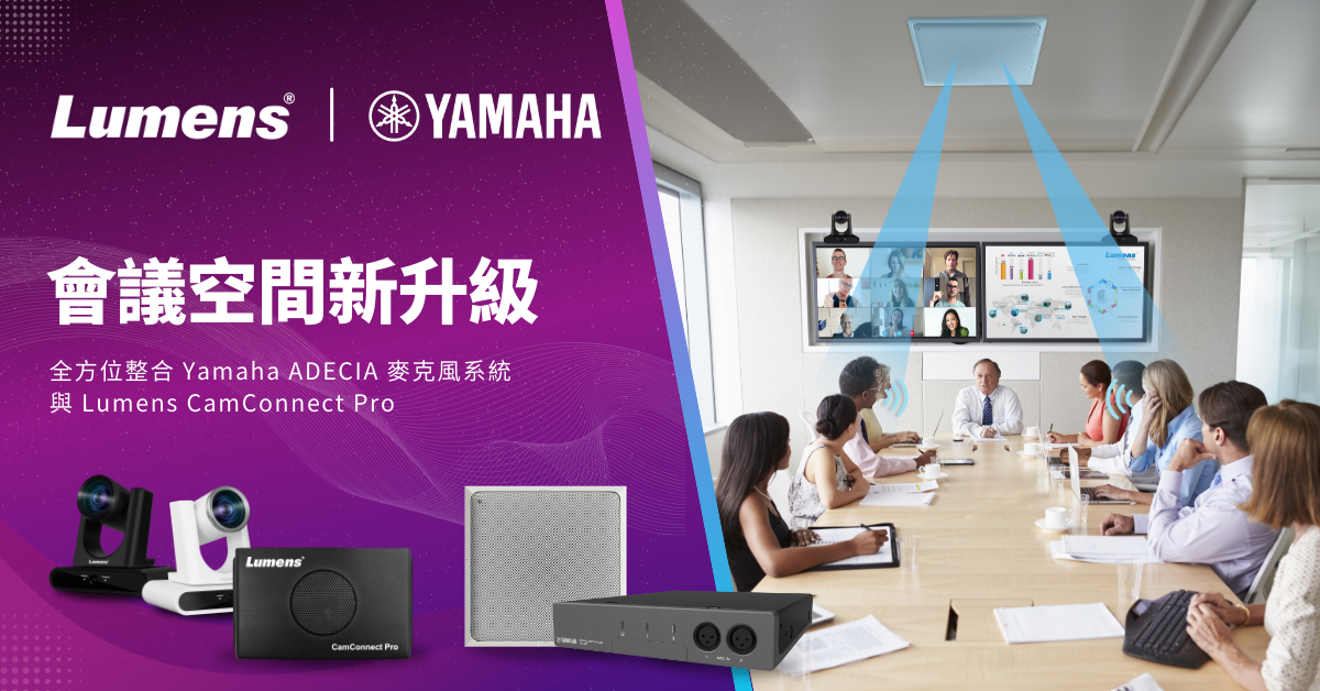Lumens® 捷揚光電宣布 CamConnect Pro 會議室聲像追蹤解決方案擴大與 Yamaha ADECIA 麥克風系統的整合。這款語音追蹤 AV 系統現在相容於 Yamaha 的 RM-TT 桌上型麥克風、RM-W 無線麥克風、RM-CG 吸頂式麥克風以及 RM-CR 音訊處理器,現在提供適合設定範圍的配置