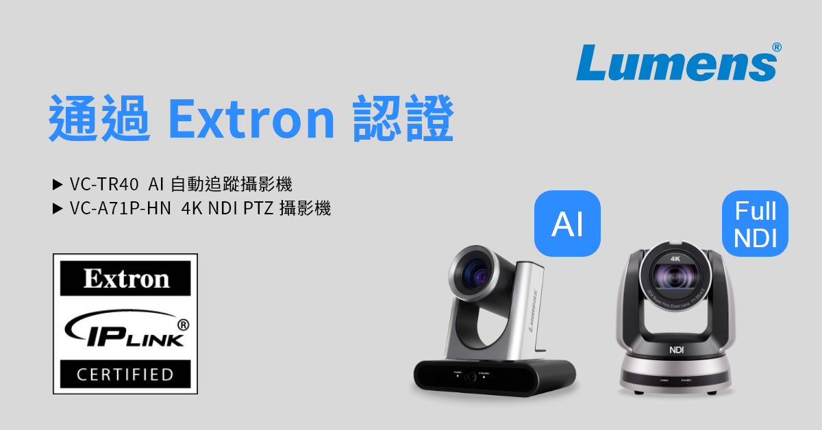 Lumens® 捷揚光電宣布與 Extron 系統整合有著重大的進展!旗下 AI 自動追蹤攝影機 VC-TR40 和 4K NDI® PTZ 攝影機 VC-A71P-HN,現已成功取得 Extron IP Link Pro 環控主機系列的認證。