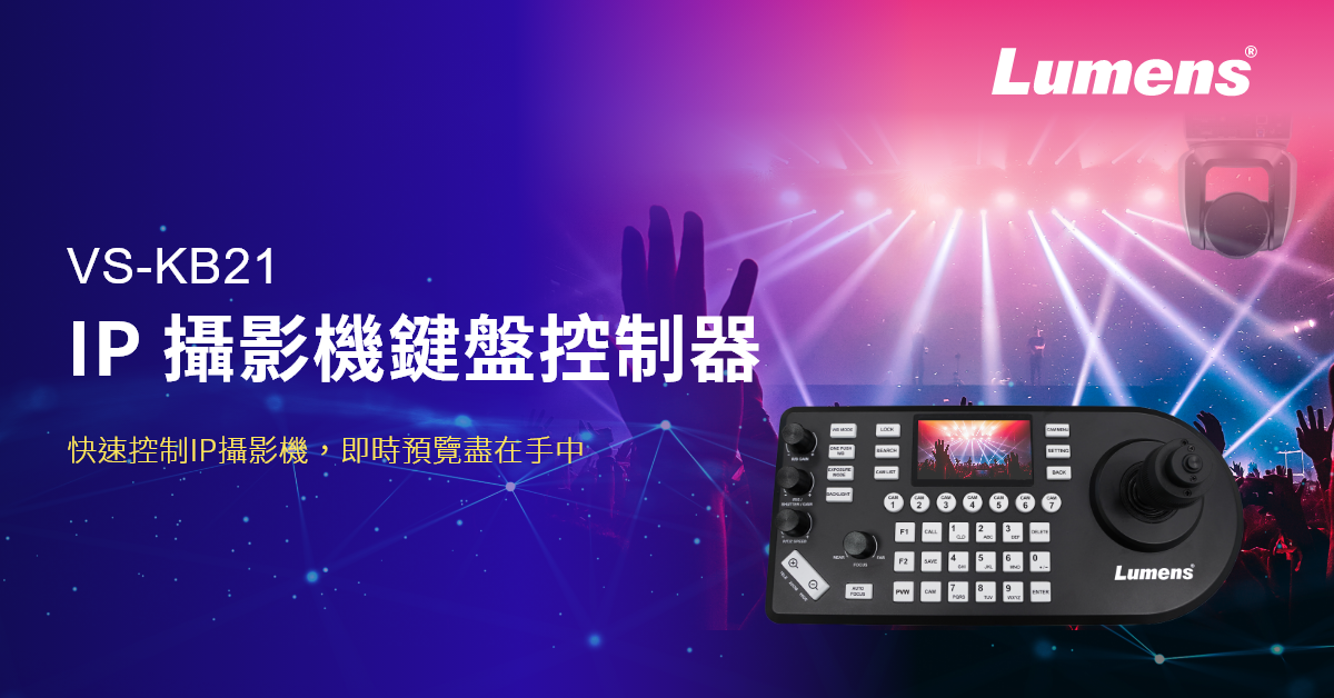 Lumens® 捷揚光電隆重推出具有 IP 影像預覽功能的 VS-KB21 IP 攝影機鍵盤控制器,其內建 3 吋 LCD 預覽螢幕改變了攝影機的拍攝體驗,為使用者提供每台攝影機的即時監控,並且能夠準確定位和操控每台攝影機。