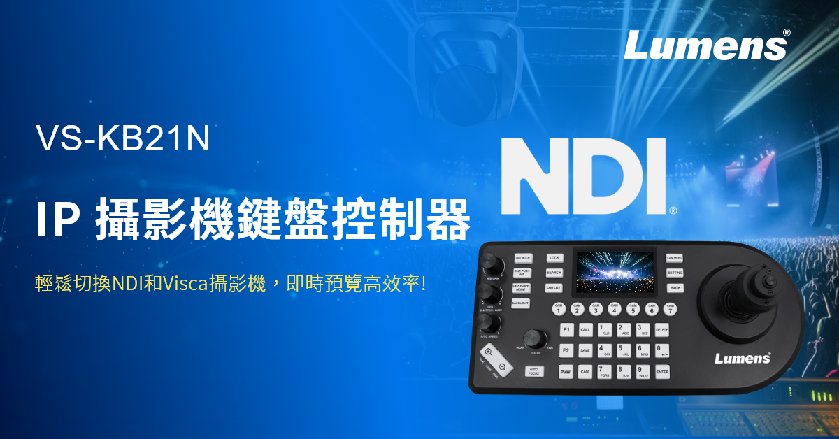 Lumens® 捷揚光電全新推出 VS-KB21N 攝影機鍵盤控制器,可透過 IP 遠端控制同一區域網路內的 NDI HX 攝影機,並支援即時影像預覽。VS-KB21N 內建3吋 LCD 預覽螢幕,為使用者提供每台攝影機的即時預覽畫面,讓操作上更直觀、更準確。
