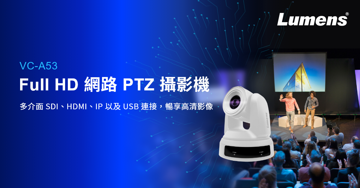Lumens 捷揚光電宣布推出新一代高清 PTZ 攝影機 VC-A53,具備 20 倍光學變焦功能。VC-A53 攝影機功能齊全,提供多類接孔同步影像輸出、多種供電選項、高速馬達效能、多樣化串流和控制選項,以及適用於虛擬製作的 FreeD 追蹤協定。